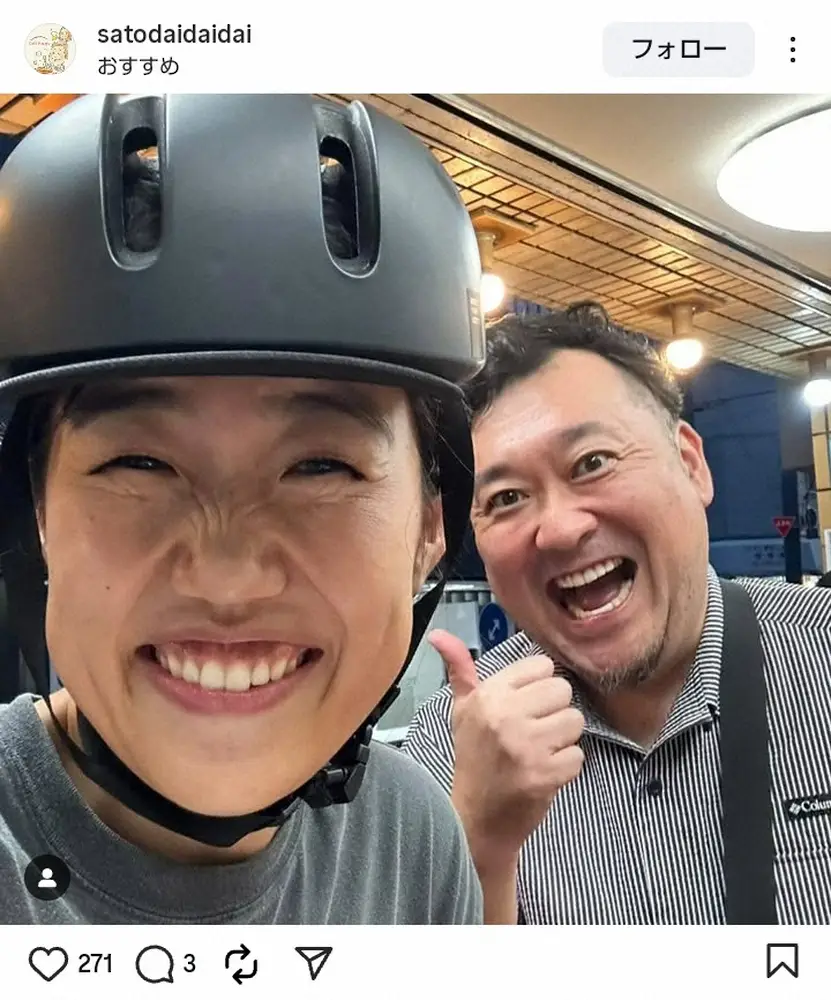 大は「肉屋さんに買い物に行ったら、なっちゃんとバッタリ遭遇」と、自転車のヘルメットを被ったお笑いタレント・横澤夏子との2ショット写真。「肉屋さんでたまたま会うなんて昔の私には想像も出来ない嬉しい遭遇」と伝えた。