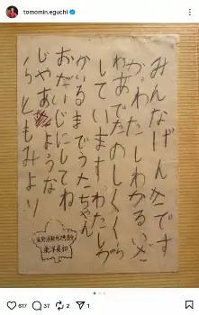 江口は「実家のアルバムを姉とかと見ていたのですが 幼稚園か小1か?母校の軽井沢追分寮から 自宅に送った手紙が貼ってありました」と、写真を公開した。