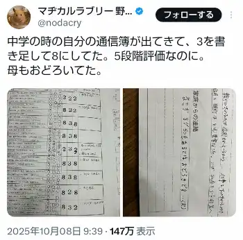 野田は「中学の時の自分の通信簿が出てきて、3を書き足して8にしてた。5段階評価なのに。母もおどろいてた」とつづり、かなりの数“改ざん”された通知表の画像を投稿。