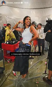 ワトソンさん シャンパンファイト中のお茶目な写真公開 腰にかっぱ巻き付けびしょ濡れ対策
