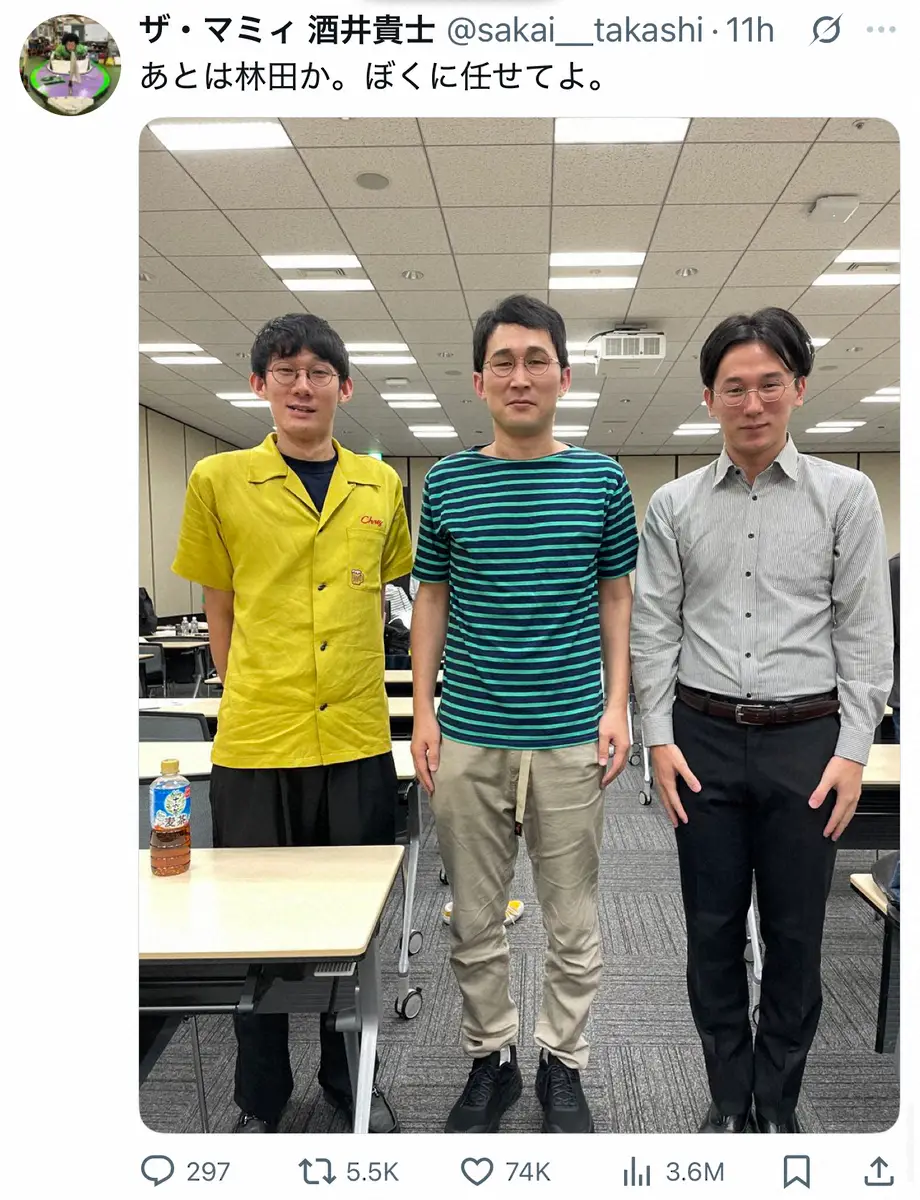 酒井は「あとは林田か。ぼくに任せてよ」と投稿。堂前、2014年大会で優勝し今大会審査員を務めた「シソンヌ」じろう、林田の3ショットをアップした。