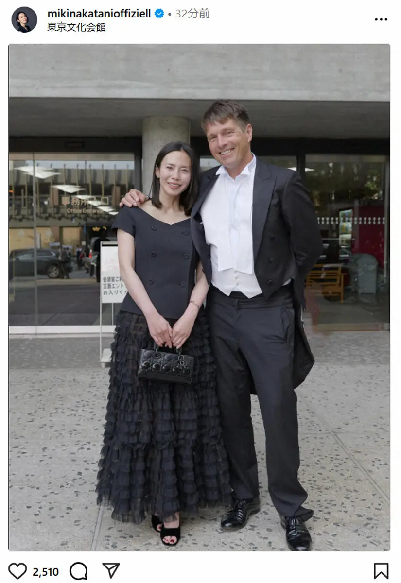 女優の中谷美紀(49)が12日、自身のインスタグラムを更新。夫でビオラ奏者のティロ・フェヒナー氏(57)との肩組みツーショットを公開した。