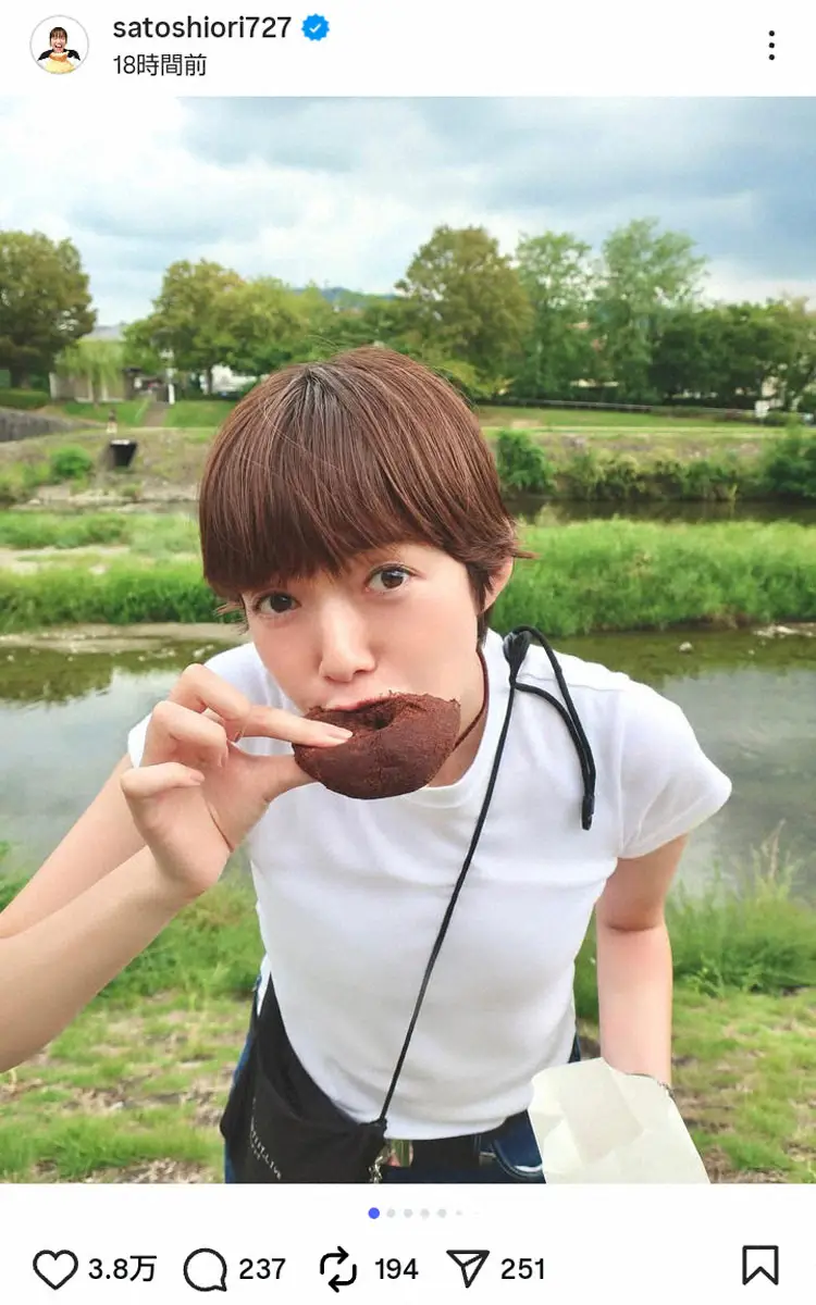 「先日の京都ごはん」と書き出し、ドーナツをほお張る写真を投稿。食べた後は口の周りが真っ黒。「出会えてよかったふわふわむちむち幸せドーナツ(カールおじさんかオバQに変化)美味しすぎてなんじゃこら」とつづった。
