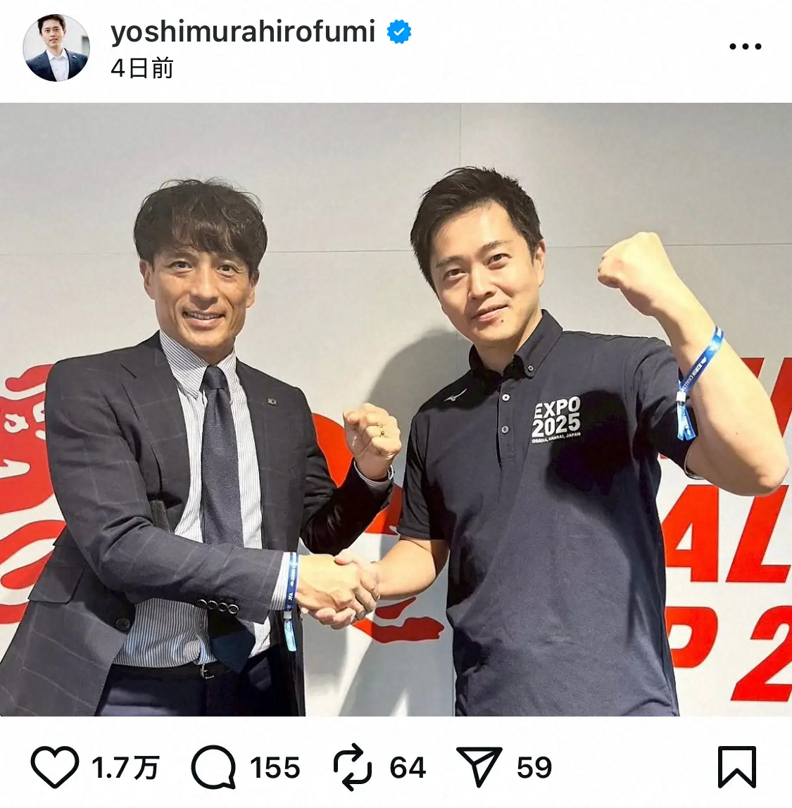 吉村氏は「サッカーの宮本さん、府立生野高校の同級生(正確には僕が一コ上)やねん」とつづり日本サッカー協会(JFA)の宮本恒靖会長との2ショットを投稿。