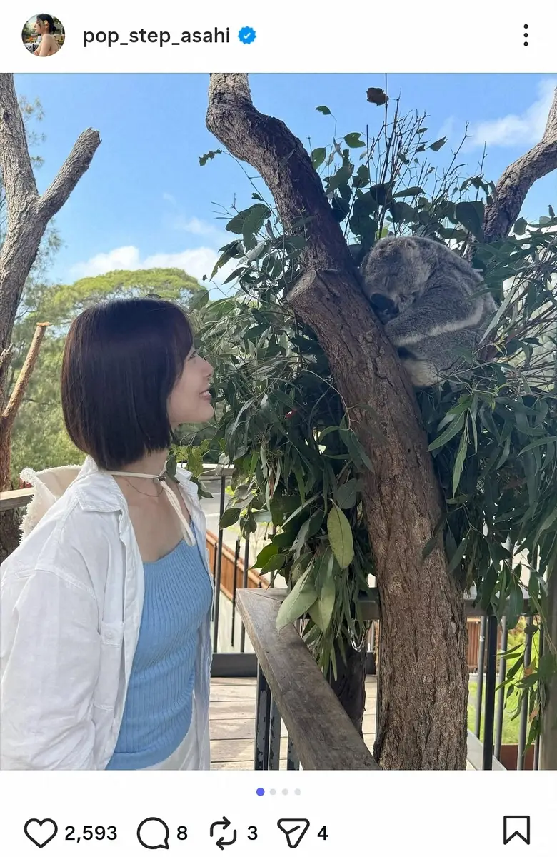 朝日は「タロンガ動物園 コアラさんに会えて幸せでした...」と書き出し、オーストラリア旅行で訪れた動物園にて、ユーカリの木につかまって寝ているコアラを見つめる“横顔ショット”を披露。
