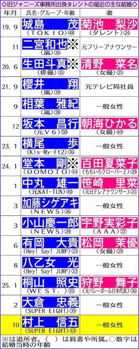 「STARTO ENTERTAINMENT」 Photo by 提供写真 SUPER EIGHT村上信五が結婚でSTARTO今年3人目 全員“関西勢” ギャラリーで見る この記事のフォト 2025年10月15日の画像一覧 もっと見る 2025年10月15日の画像をもっと見る