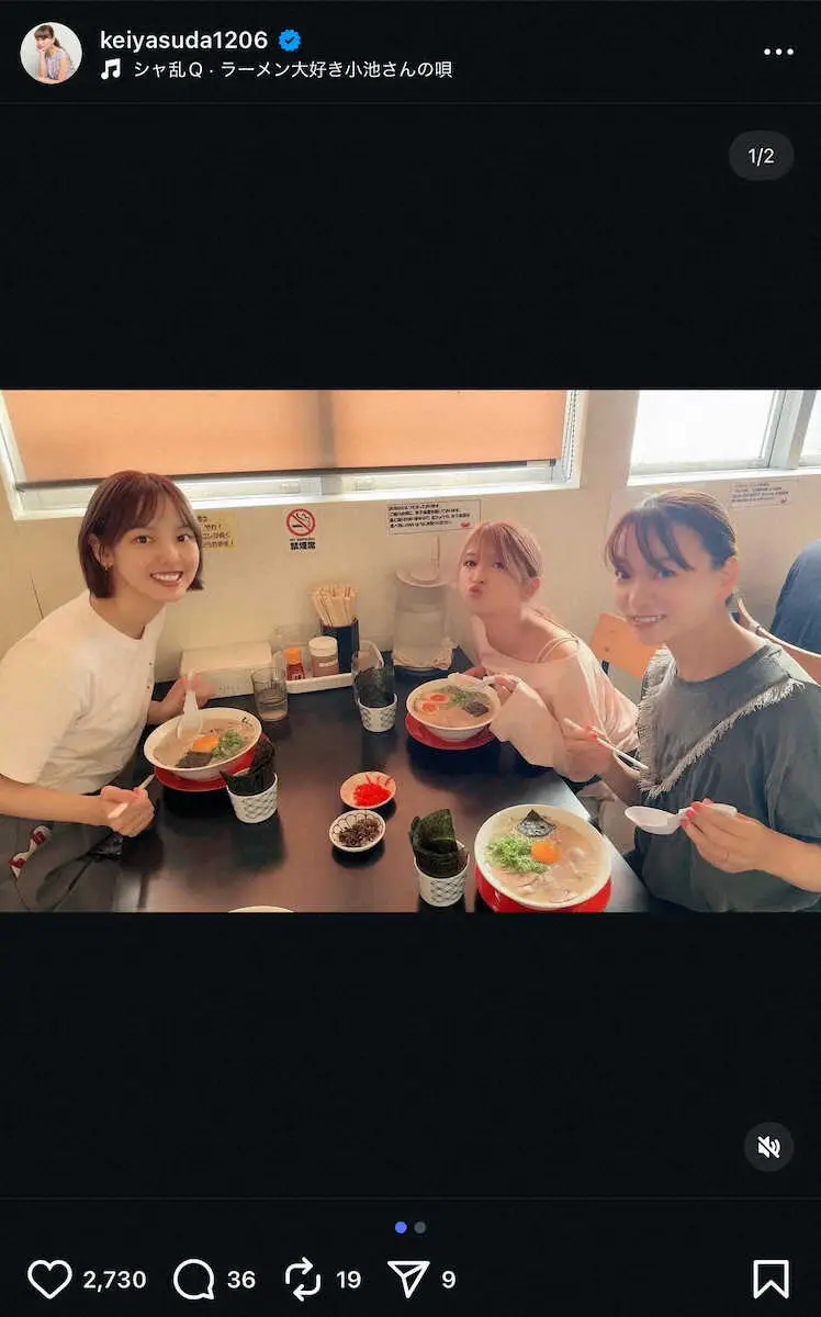 「空き時間に佐賀ラーメン食べましたよ!」と、保田と同じく元モーニング娘。の矢口真里、飯窪春菜とのラーメンショットを公開した。