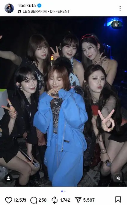 「Love」と書き出してハートのハンドサイン絵文字を添えた幾田。K―POP女性5人組グループ「LE SSERAFIM(ル セラフィム)」との集合写真を掲載した。