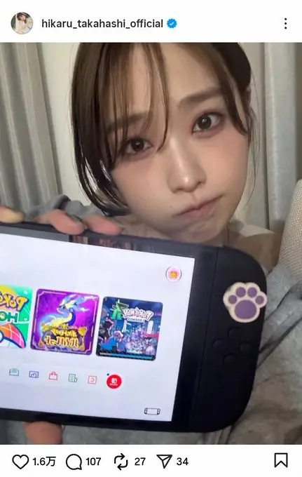 写真にはどアップでNintendo Switchを掲げてキュートな表情を浮かべる高橋の姿が。
