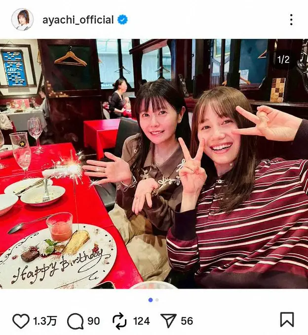 「現場で初めて会った時は高校生だったね」「2枚目は、初めて2人でランチしたときのお肉を食べた会だったので、次回はパスタを食べよう!笑」として過去の写真も公開。「改めて美来ちゃんおめでとう」と伝えた。