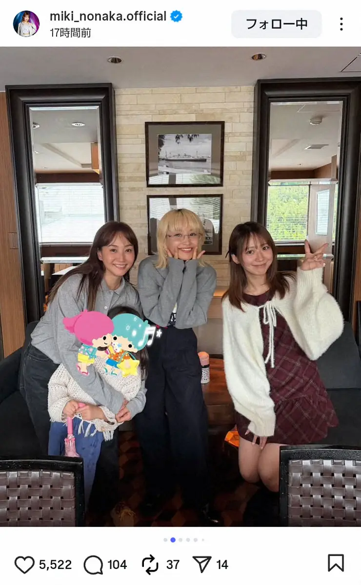 モーニング娘。’25のリーダー・野中美希(26)が17日までに自身のインスタグラムを更新。元モーニング娘。でタレントの藤本美貴(40)、歌手の高橋愛(39)との「リーダーズ」集合ショットを公開し、注目を集めている。