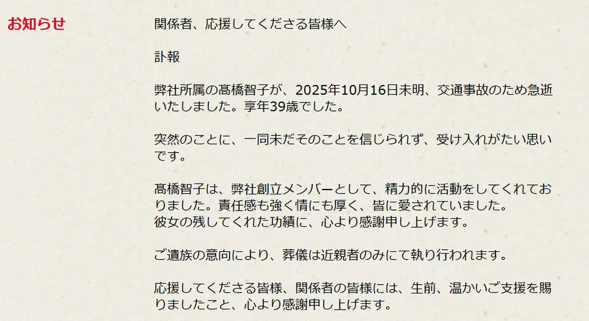 髙橋智子さん(碗プロダクション公式サイトから) 女優・髙橋智子さん 交通事故で急逝 39歳 所属事務所発表 舞台中心に… ギャラリーで見る この記事のフォト 2025年10月18日の画像一覧 もっと見る 2025年10月18日の画像をもっと見る