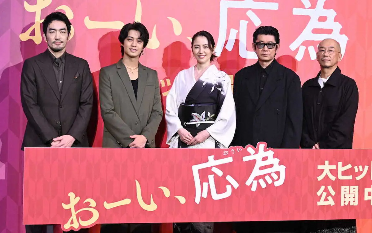 映画「おーい、応為」の初日舞台あいさつに出席した(左から)大谷亮平、髙橋海人、長澤まさみ、永瀬正敏、大森立嗣監督