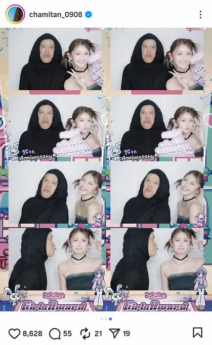 同じくイベントに出演し“四足歩行”スタイルでランウエーを歩いて話題となった「野性爆弾」くっきーとのプリクラ写真を掲載。「みんなたのしかった!?」とファンへ呼びかけた。