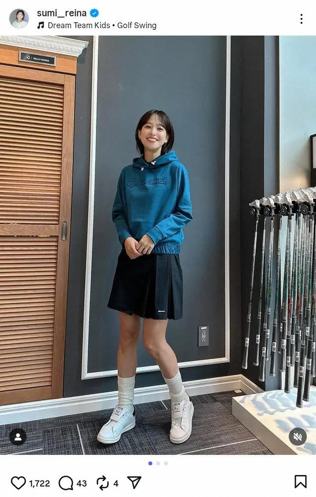 鷲見は「ルーズソックスみたいな靴下が可愛い」と書き出し、「洗練されていて機能性も兼ね備えたTaylorMadeのウェア」と投稿。ブルーのパーカーに黒いミニスカート、白いソックスを合わせたゴルフウエア姿を披露した。
