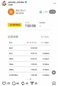 この投稿にファンからは「凄い!速い!おつかれ様でした」「素晴らしいタイム、速かったですねー」「美沙子さんは素晴らしいアスリートです」「練習の成果が出ましたね!」など絶賛の声が寄せられた。
