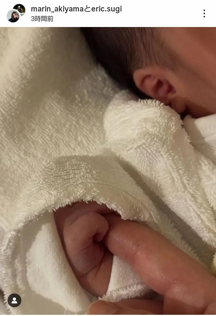 秋山と杉本の共同投稿で、ベビーが小さな手で指を握るショットとともに「Welcome to the world, baby girl」と女の子の誕生を伝えた。