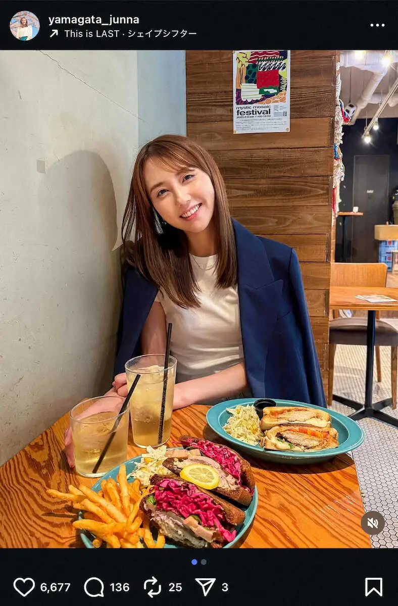 TBSの山形純菜アナウンサー(31)が24日までに自身のインスタグラムを更新。秋のジャケットコーデでランチした様子を投稿した。