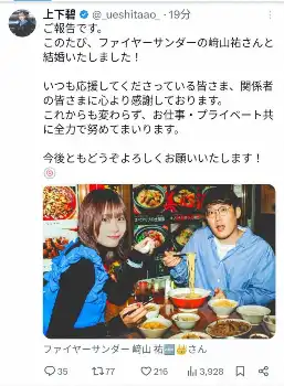 結婚を報告した上下碧。公式X(@_ueshitaao_)から Photo by スポニチ 元「仮面女子」上下碧 結婚を発表 お相手はお笑いコンビ「ファイヤーサ… ギャラリーで見る この記事のフォト 2025年10月24日の画像一覧 もっと見る 2025年10月24日の画像をもっと見る