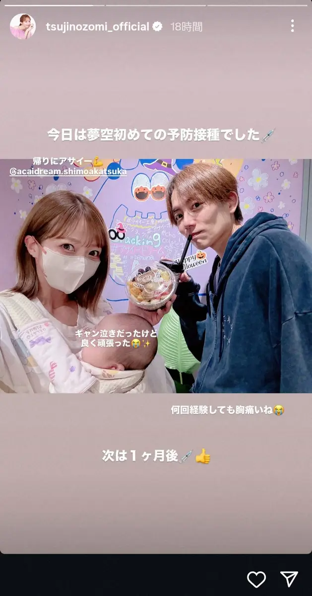 辻は「今日は夢空の初めての予防接種でした」とつづり、抱っこひもに支えられる8月誕生の次女と、ブルーのパーカー姿の夫でタレントの杉浦太陽との“家族ショット”をアップ。
