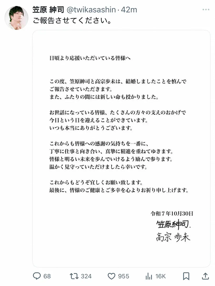 笠原紳司(2004年撮影) Photo by スポニチ 19歳差婚!俳優・笠原紳司&女優・高宗歩未、結婚を発表「新しい命も授か… ギャラリーで見る この記事のフォト 2025年10月30日の画像一覧 もっと見る 2025年10月30日の画像をもっと見る