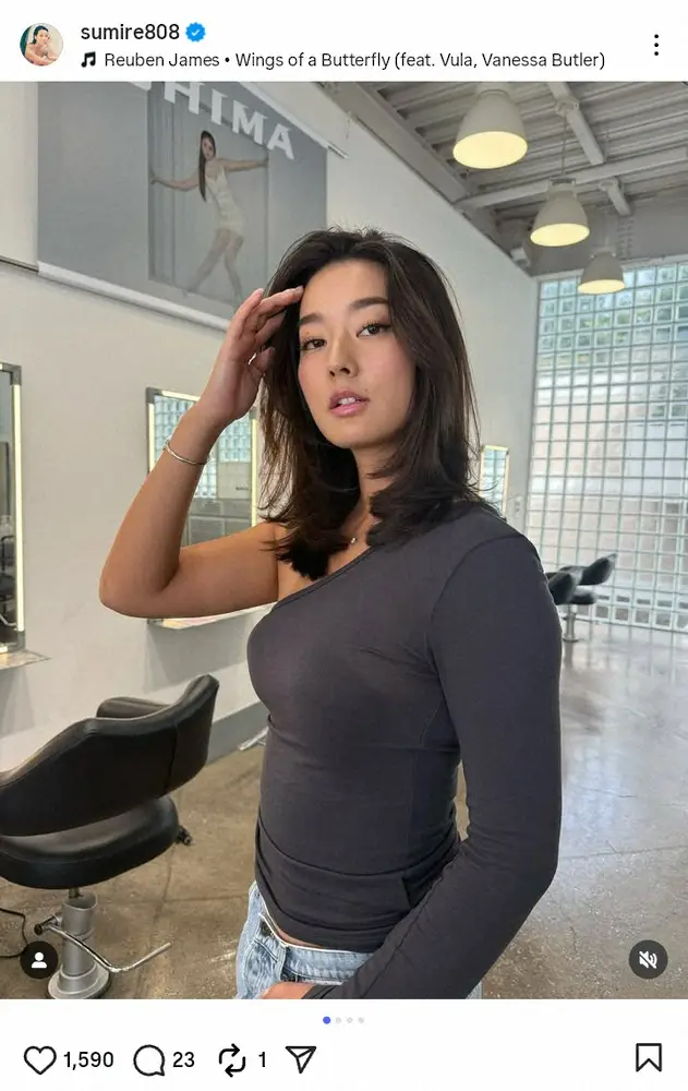 すみれは「To the dark side(=ダークサイドへ)」とコメント。ワンショルダーのトップスにデニムを合わせたファッションで、ヘアサロンでの写真をアップした。