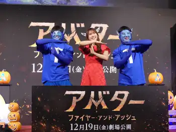 同作に登場する人間型の種族「ナヴィ」のメークを施し、キャスター付きのイスに座り相方の松尾駿(43)に押される形で登場。炎を題材にした作品にちなみ、松尾から炎の中で綱渡りをして作品をPRしてほしいと提案されると「両足いってまうよ!」と笑い飛ばした。