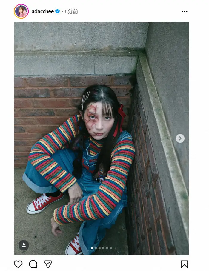 足立は「HALLOWEEN I'm CHUCKY」とつづり、ホラー映画「チャイルド・プレイ」のチャッキーの仮装を披露。傷風のメイクなど本格的な仕上がりだった。