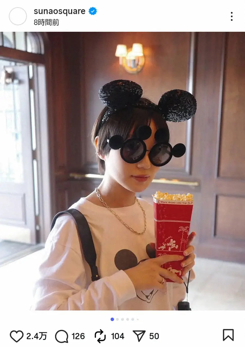「親友と久しぶりのディズニー」とつづった奈緒。ミッキーのカチューシャに、ミッキーのサングラス、ミッキーのロンTと“ミッキーコーデ”を披露した。