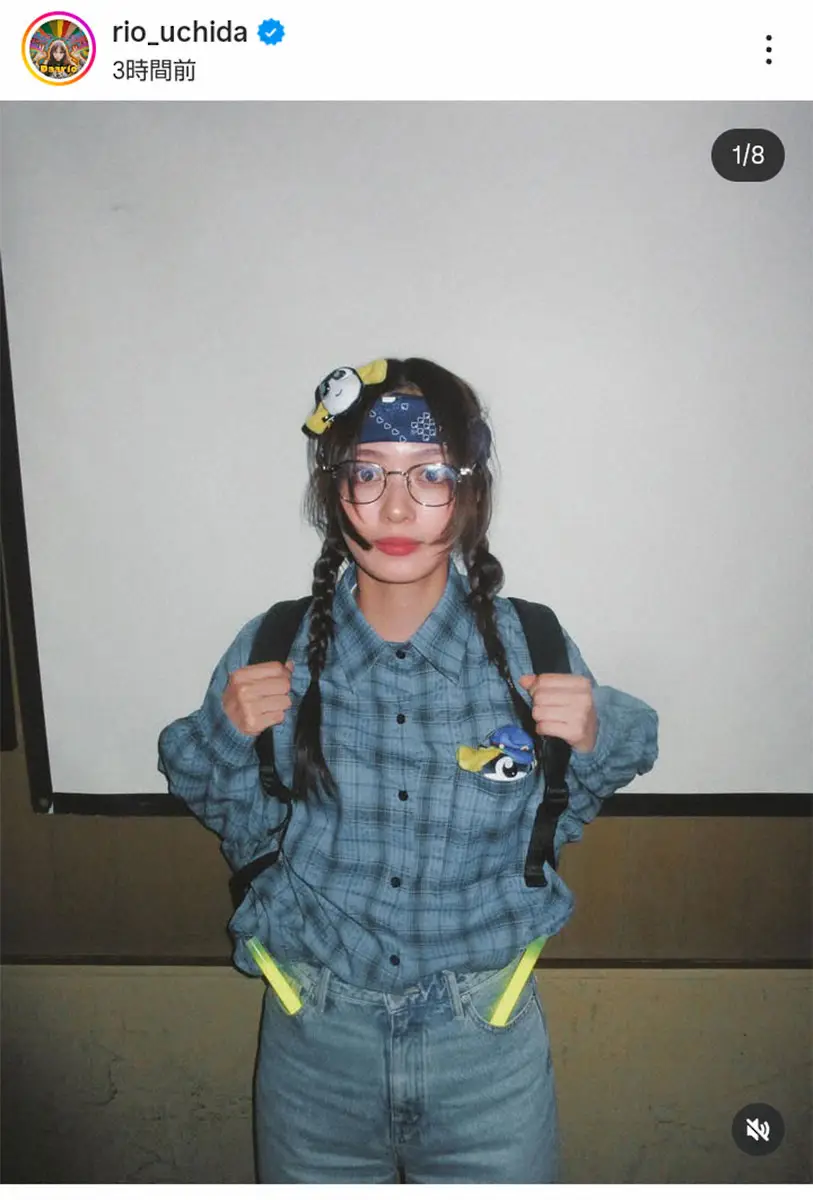 内田は「はっぴーハロウィン ほぼ家にあるもので集合」つづり、眼鏡にバンダナを頭に巻き、チェックのシャツをデニムにインし、リュックを背負う“オタク”姿を披露。