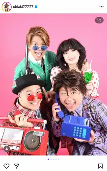 千秋は「マルベル堂で80年代風に撮影してもらいました」とタレントのヒロミ、お笑いコンビ「チョコレートプラネット」との写真を披露。