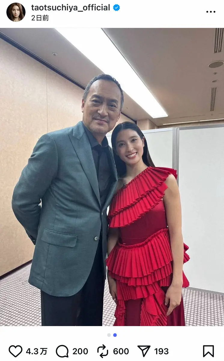 土屋は自身が出演する映画「盤上の向日葵」が公開されたことを報告。「この写真はジャパンプレミアに参加したとき、渡辺謙さんと撮っていただきました」とつづり、同作で初共演を果たした渡辺と肩を寄せる2ショットを投稿した。