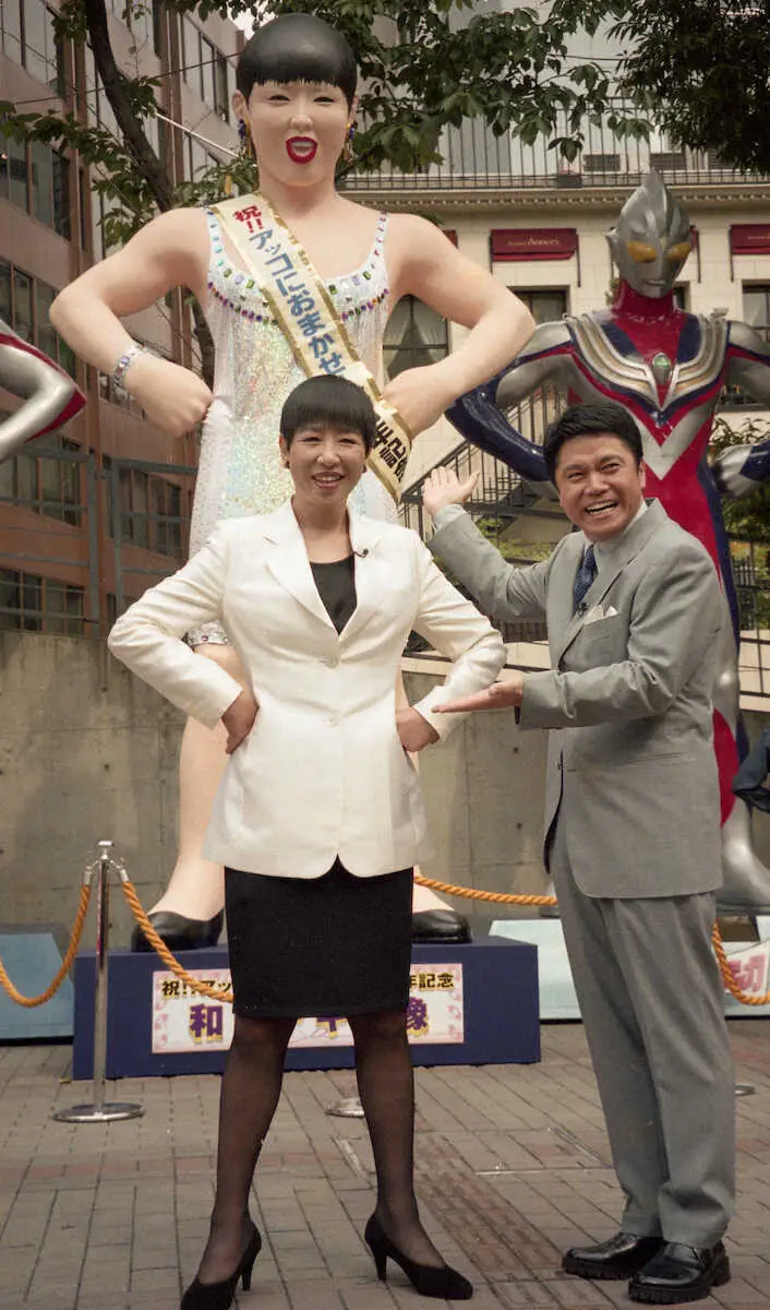 放送15周年を迎え、アッコ像の前でポーズをとる和田アキ子と峰竜太(右)
