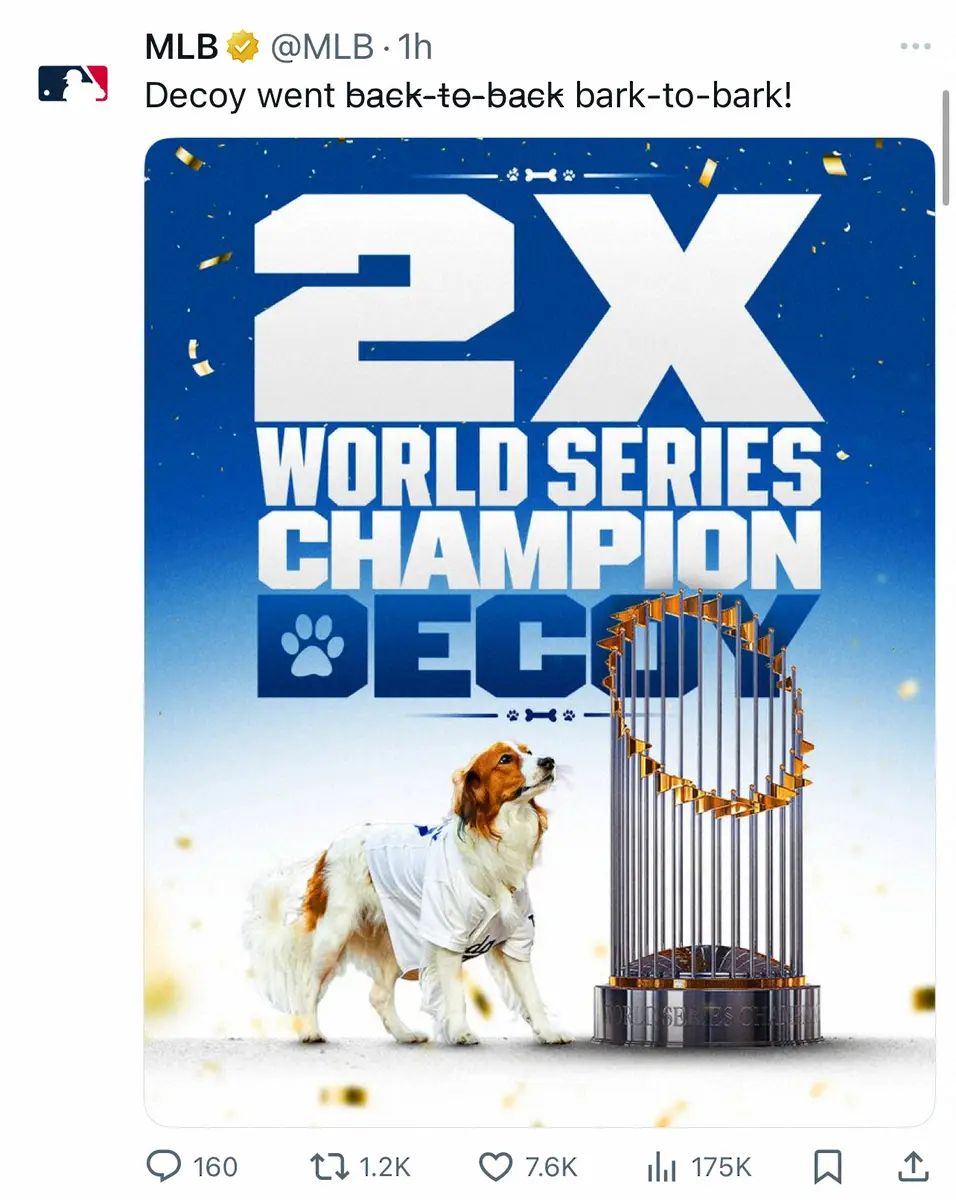 WS制覇一夜明け…MLB公式が投稿“デコピン画像” に反響!「注目の的」「おめでとう」の声
