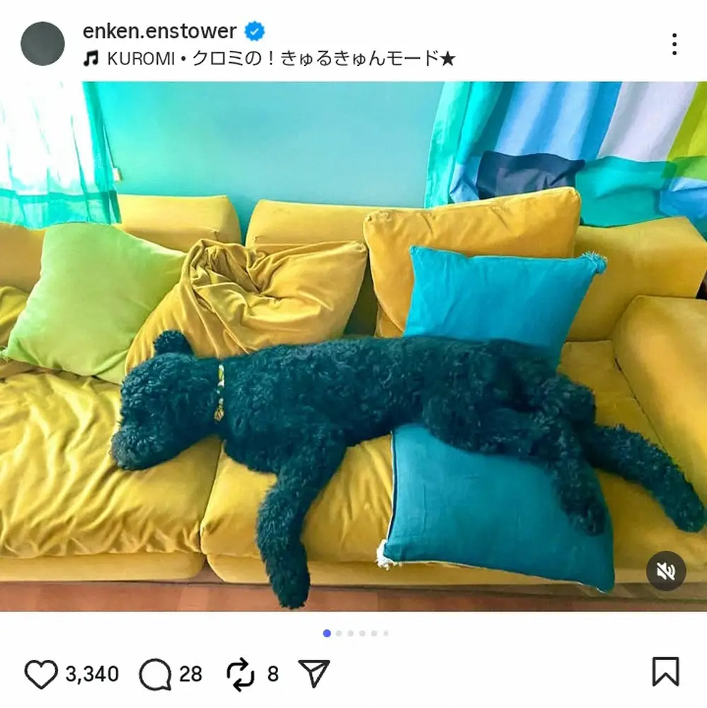遠藤は「4人掛けソファの半分以上を使って寝ます」と、黄色いソファで寝そべる愛犬の姿をアップ。しかし「クッションの四角は破壊済みです」と打ち明け、「観察してると楽しいです」と伝えた。