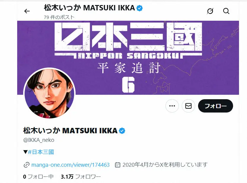 漫画家の松木いっか氏が8日、自身のXを更新。病気療養のため連載中の作品「日本三國」を不定期連載とすることを報告した。