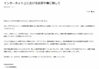 =LOVE SNS上の誹謗中傷めぐり警告 投稿者を特定し訴訟提起したと発表「法的措置を適宜講じる」