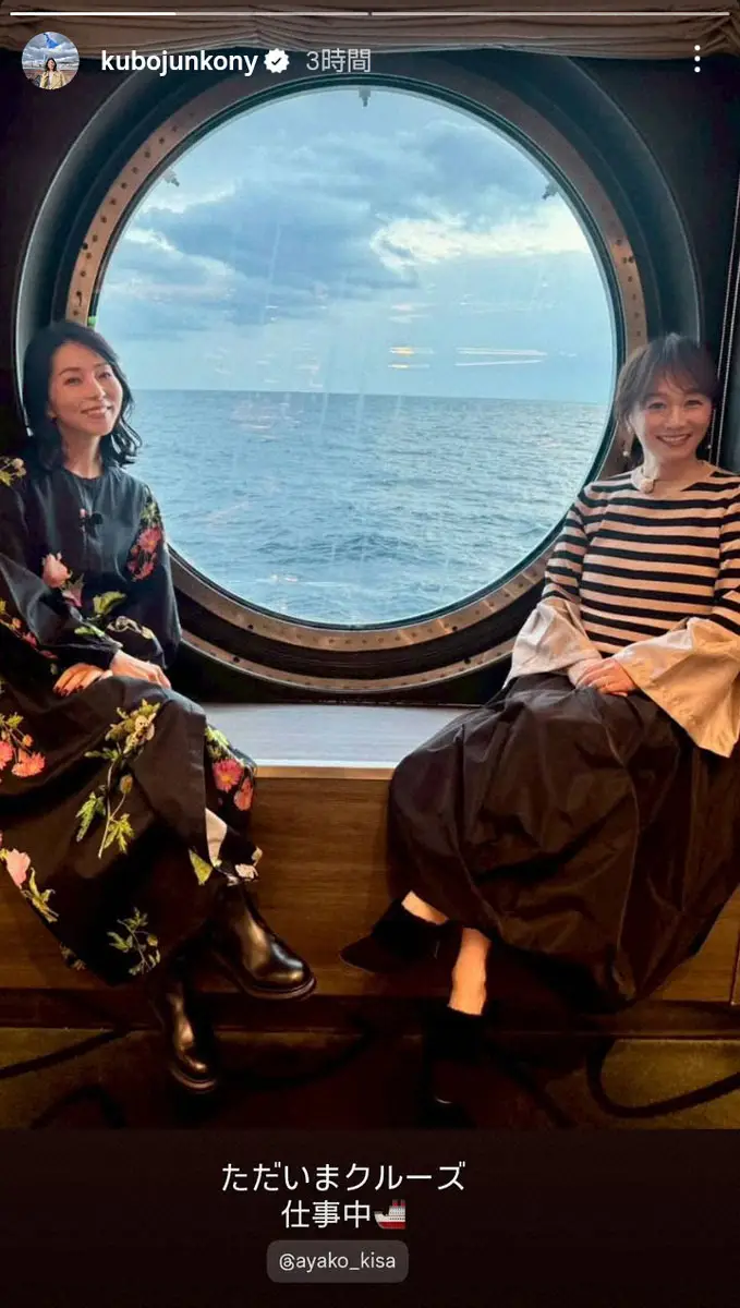 久保アナは木佐アナとのツーショットを公開。クルーズ船の窓から海がのぞくショットになっており、「ただいまクルーズ。仕事中」とコメントした。
