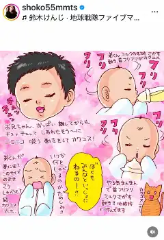 「双子の表情がどんどん変わっていくのおもしろいから 絵日記にしました」と絵日記を公開。「ニコッと笑うのが兄 ニヤッと笑うのが弟 シェーするのが弟」とつづった。