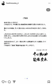 2人は連名の報告文をアップし「私事で恐れ入りますが、この度私たち、中村橋之助と能條愛未は結婚する運びと相成りました」と改めて発表。「舞台での共演後、互いに惹かれ合い4年半の月日を共に過ごしてきました。これからの人生を共に歩みたい。この人を一生大切にしたいと言う二人の想いから、この先の様々な事を共有し支え合える夫婦になれると確信いたしました」と記した。