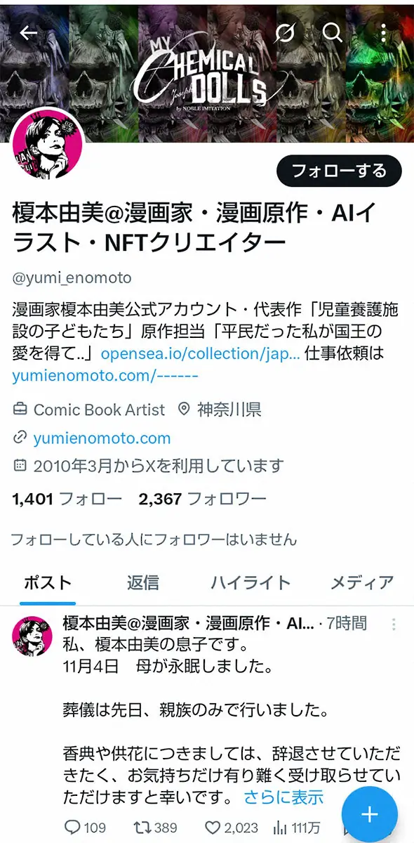 榎本由美さん公式インスタグラム(@yumi_enomoto)から 漫画家の榎本由美さんが死去 60歳 代表作に「児童養護施設の子どもたち… ギャラリーで見る この記事のフォト 2025年11月12日の画像一覧 もっと見る 2025年11月12日の画像をもっと見る