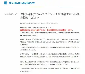 ウェブ小説サイト「カクヨム」異例の注意喚起「過度な頻度で作品投稿を行うことはお控えください」