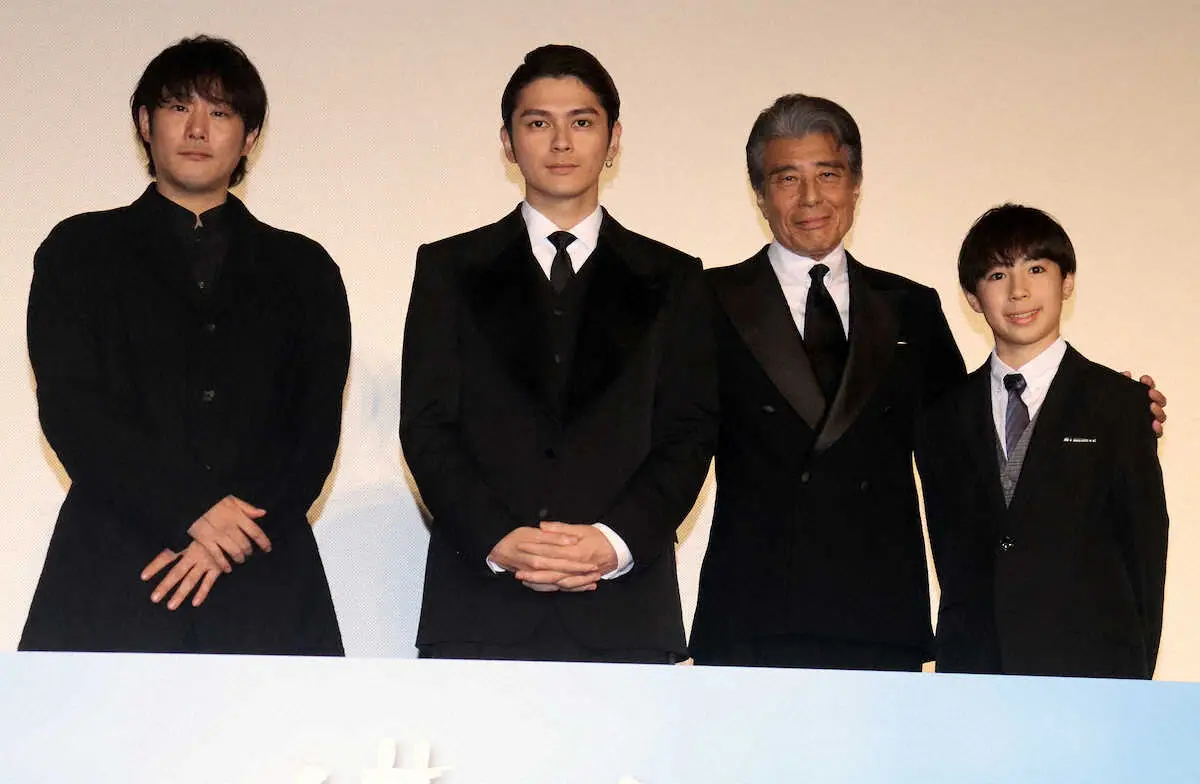 映画「港のひかり」の初日舞台あいさつを行った(左から)藤井道人監督、眞栄田郷敦、舘ひろし、尾上眞秀