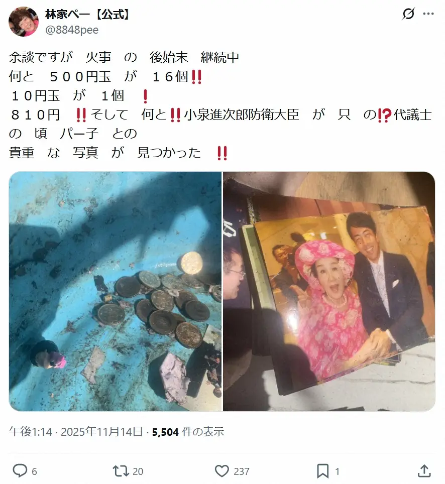 「余談ですが火事の後始末継続中何と500円玉が16個!!10円玉が1個!810円!!そして何と!!小泉進次郎防衛大臣が只の!?代議士の頃パー子との貴重な写真が見つかった」とつづり、写真を投稿した。