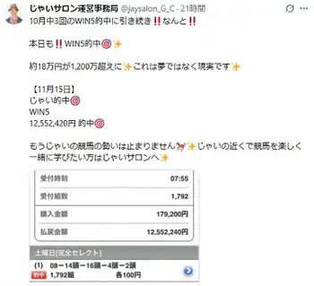 お笑いトリオ「インスタントジョンソン」じゃいのサロン運営事務局X(@jaysalon_G_C)から 競馬芸人 「えぐぅwww」な的中!驚きの払い戻し額に「これは夢ではなく現… ギャラリーで見る この記事のフォト 2025年11月16日の画像一覧 もっと見る 2025年11月16日の画像をもっと見る