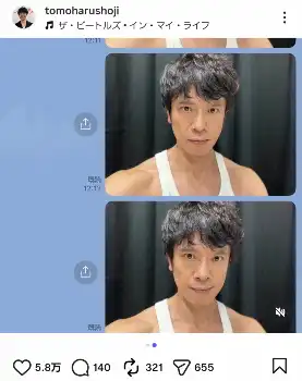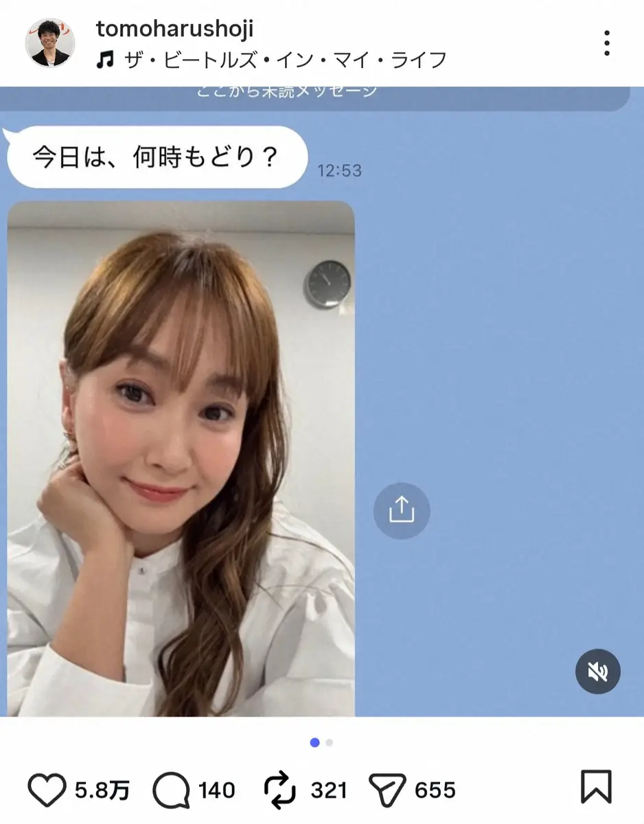 庄司は、冒頭ハッシュタグで「俺のオンナ」と書き出し「未だに写真送りあってるのも 結婚17年目で 我ながら凄いと思うけど 私は貰うのは嬉しいけど ミキティは流石に嬉しくないと思うw ただのおじさんだからw」とつづり、妻の“ミキティ”こと藤本からの自撮り写真を添えた“イチャイチャLINE”を公開。