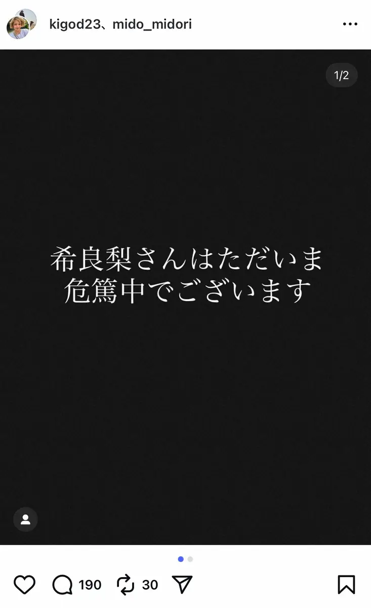 希良梨さんインスタグラム(@kigod23)から がん闘病中の希良梨さん インスタに「ただいま危篤中でございます」の投… ギャラリーで見る この記事のフォト 2025年11月19日の画像一覧 もっと見る 2025年11月19日の画像をもっと見る