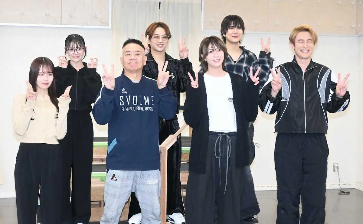 フォトセッションに応じる(前列左から)「乃木坂46」佐藤璃果、「FUJIWARA」原西孝幸、笹森裕貴、雷太(後列左から)志田こはく、佐藤友祐、仲田博喜(撮影・松尾 知香)
