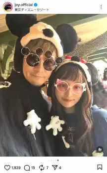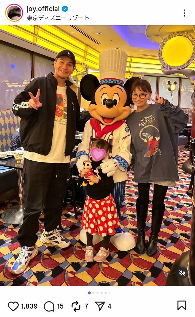 タレントのJOY(40)が20日、自身のインスタグラムを更新。モデルでタレントの妻・わたなべ麻衣(36)と5歳の誕生日を迎えた娘とディズニー家族ショットを披露した。
