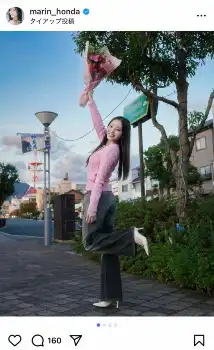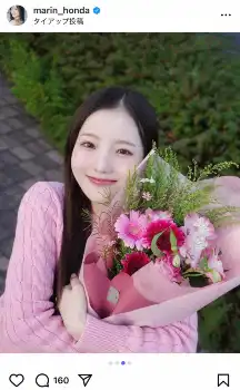 本田さんは「可愛いリップと合わせて久しぶりのピンク」「出雲でお仕事があり素敵なピンクのお花まで頂いちゃいました」とピンクのニットを着て花束を抱える姿や全身ショットを披露。